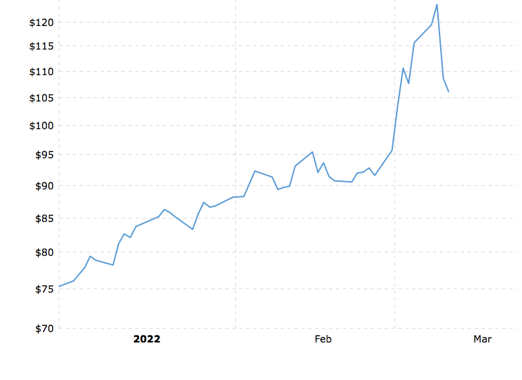 West Texas Intermediate Crude is trading over $100/barrel, a price not seen since the summer of 2014. But the increase so far in 2022 is dramatic.